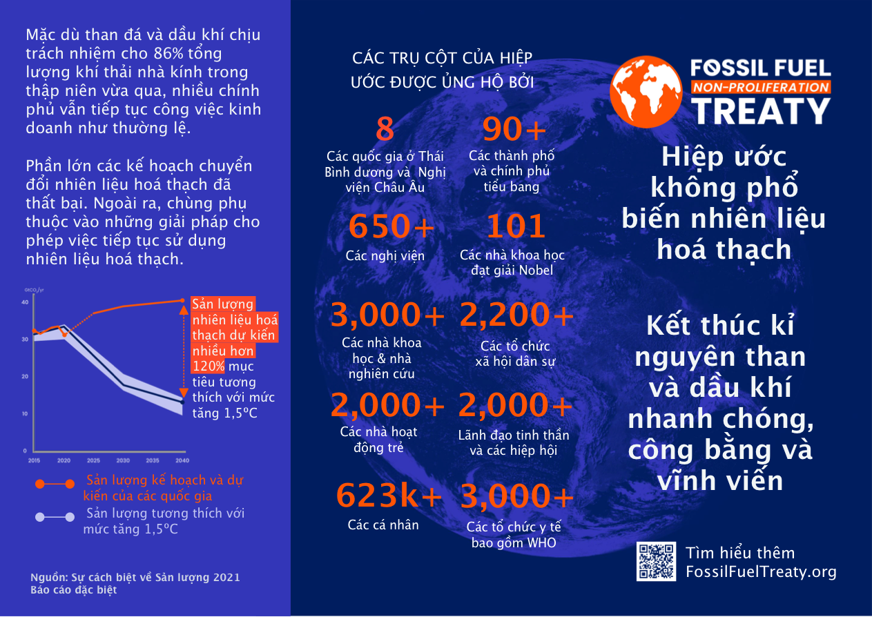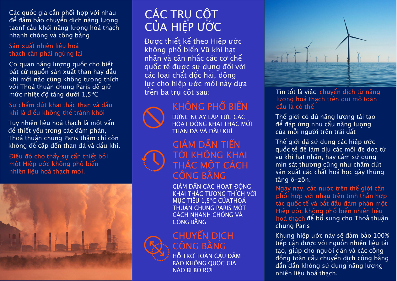 Vì vậy, cần có một thỏa thuận bổ sung. Giống như 50 năm trước, khi thế giới sử dụng các hiệp ước quốc tế để xoa dịu các mối đe dọa do vũ khí hạt nhân gây ra1, ngày nay, thế giới cần một Hiệp ước không phổ biến Nhiên liệu hoá thạch để loại bỏ dần nhiên liệu này, hỗ trợ các nền kinh tế phụ thuộc, người lao động và cộng đồng đa dạng hóa khỏi sự phổ biến nhiên liệu hoá thạch, đảm bảo 100% khả năng tiếp cận năng lượng tái tạo trên toàn cầu và thúc đẩy quá trình chuyển đổi công bằng không để ai bị bỏ lại phía sau.