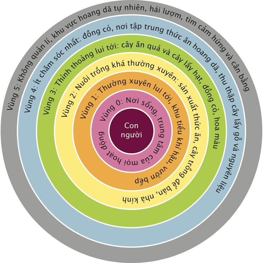 Vùng 1: Đây là khu vực gần nhà, được sử dụng và quản lý tập trung nhất. Ví dụ: vườn bếp, động vật nhỏ, kho dụng cụ, bể thu nước mưa. Các diện tích trồng cây ở khu vực 1 thường được che phủ hoàn toàn, sử dụng một hệ thống gồm lớp mùn tấp ủ, được tưới tiêu đầy đủ bằng các hệ thống như hệ thống tưới tiêu nhỏ giọt được đặt dưới lớp che phủ của vườn.