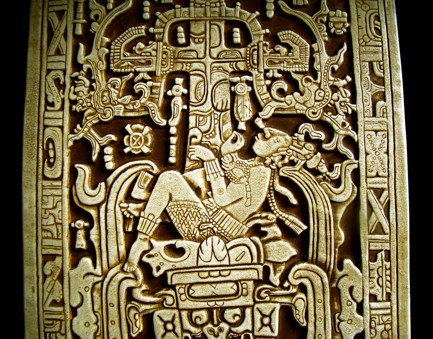 Một bản sao nắp quan tài của người trị vì Maya của Palenque, Vua Pakal Vĩ đại, còn được biết tới như K'inich Janaab' Pacal (23, tháng 3 năm 603 CE – 31, tháng 3 năm 683 CE). Trong cảnh này, vị vua đang rơi xuống những cái miệng kinh hoàng của thế giới bên kia của người Maya, Xibalba. @Copyright Marcellina Rodriguez.