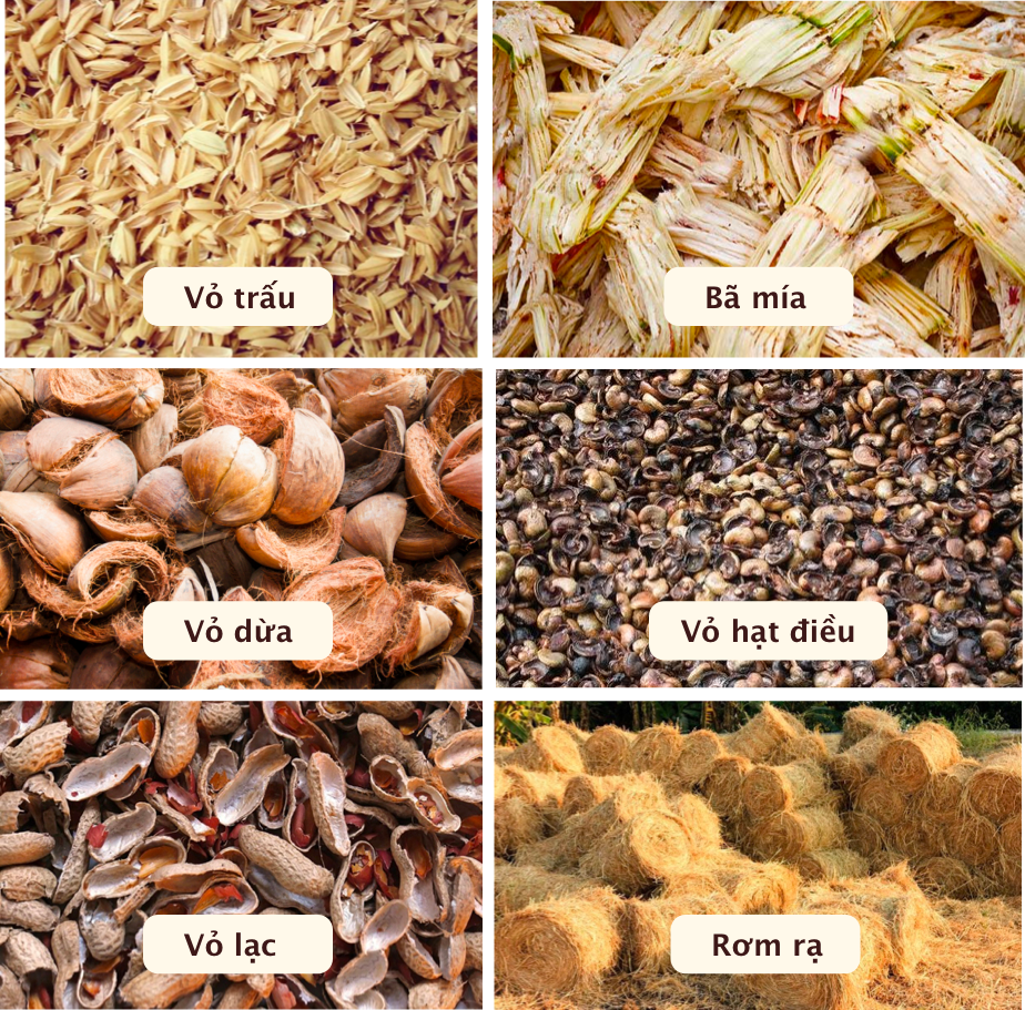 Trong quá trình sản xuất nông nghiệp hay chế biến nông sản, bên cạnh những sản phẩm chính sẽ phát sinh những phế phụ phẩm khác khiến cho nền nông nghiệp đã và đang phải đối mặt với việc xử lý phế thải trồng trọt, đặc biệt khi mùa thu hoạch đến. Khi trồng lúa ngoài hạt lúa thu hoạch được ta còn có rơm, rạ; khi xay xát thóc ngoài gạo ta còn có tấm,cám, trấu; khi thu hoạch ngoài hạt ngô ta còn có bẹ ngô, áo ngô, lõi ngô... Trong chăn nuôi gia súc, ngoài sản phẩm chính là thịt, trứng hay sữa ta còn có phân... Các phế thải nông nghiệp phát sinh từ hoạt động trồng trọt rất đa dạng như: rơm, rạ, vỏ trấu, vỏ cà phê, lõi ngô, xơ dừa, dây khoai, thân cây đậu...(Hình 2).