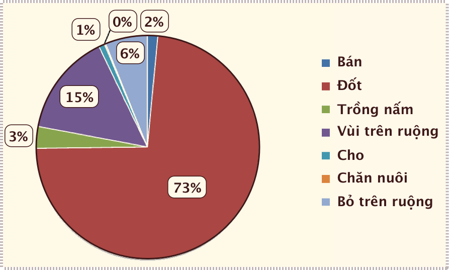 Theo kết quả khảo sát của Trịnh Sĩ Nam về các hình thức sử dụng phế phụ phẩm nông nghiệp ở Đồng bằng sông Hồng năm 2012, (Hình 3) cho thấy có 6 biện pháp xử lý phế phụ phẩm được người dân lựa chọn là: đốt trên đồng, vùi trong đất, làm giá thể trồng nấm, bán, chăn nuôi và cho người khác. Trong đó, tỷ lệ các hộ xử lý phế phụ phẩm sau thu hoạch bằng biện pháp đốt là 73,14%; vùi là 16,28%; làm giá thể trồng nấm là 3,46%; bán là 1,64%; chăn nuôi là 0,19% và cho người khác là 0,95%. Điều này cho thấy đốt phế phụ phẩm vẫn là biện pháp xử lý phổ biến nhất của nông hộ hiện nay, các hình thức sử dụng khác thì ít được phổ biến hơn.