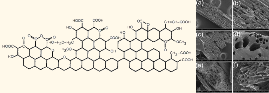 Hình 4: Mạng lưới tinh thể bề mặt than sinh học (trái), biochar phóng to (trái)