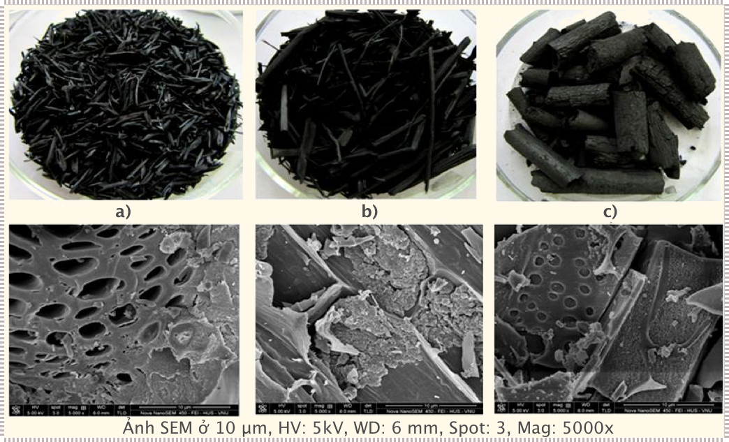 Hình 4: Ảnh SEM của mẫu biochar từ vỏ trấu (a), rơm rạ (b) và gỗ củi © dùng lò đốt L1