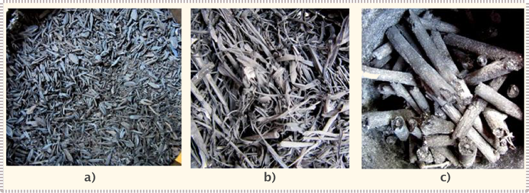 Hình 5: Mẫu biochar từ vỏ trấu (a), rơm rạ (b) và gỗ củi © dùng bếp trấu rút lòng-gián đoạn (B2)