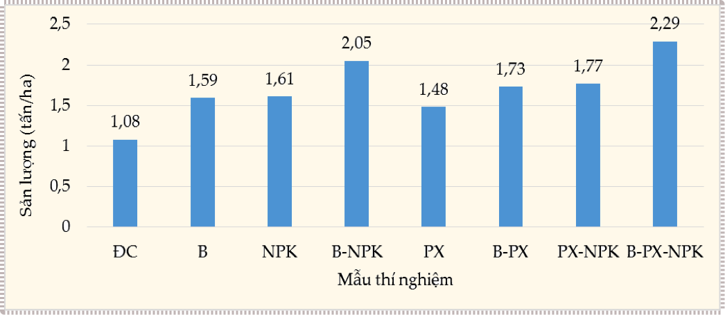 Hình 7: Ảnh hưởng của biochar đến sản lượng lạc ở Ninh Thuận. Trong đó, Biochar (B) từ các lò đốt trấu là 12 tấn/ha; phân bón NPK lần lượt là 30, 26, 75 kg/ha; phân xanh (PX) là 5 tấn/ha. Nhóm Đối chứng (ĐC) không bón phân.