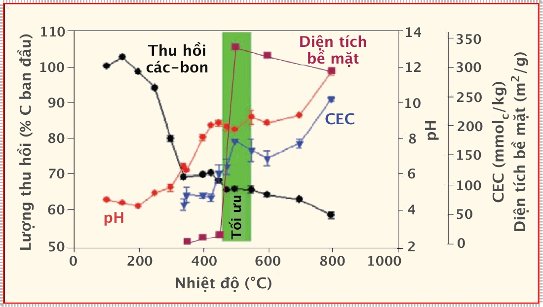 Hình 1: Đặc điểm biochar, CEC, độ pH và diện tích bề mặt thay đổi theo nhiệt độ