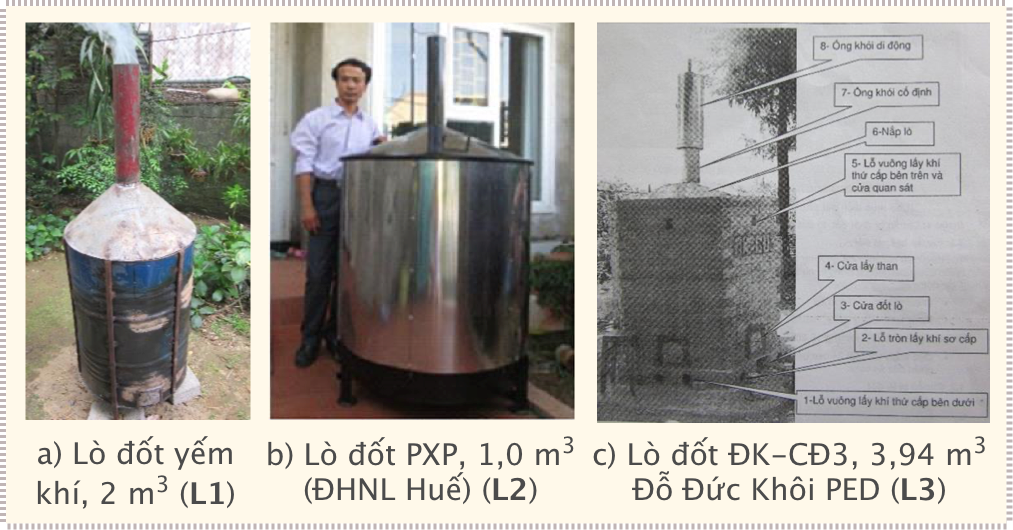 Biochar được tạo ra từ nhiều kiểu lò khác nhau. Một số mẫu lò đốt tạo biochar từ đơn giản, xây bằng đất, gạch đến phức tạp, đòi hỏi phải đầu tư về máy móc thiết bị. Vì thế, những nước đang phát triển cũng có thể tự sản xuất biochar. Lò đốt biochar khảo sát làm bằng sắt, thép, inox (L1, L2) hoặc gạch và inox (L3) (Hình 2). Tuy nhiên, việc sản xuất biochar sẽ thuận lợi, hiệu quả và đỡ tốn công sức hơn nếu được đầu tư đồng bộ và tự động hóa. NLSK từ phụ phẩm nông nghiệp như trấu, rơm rạ đã được sử dụng rất phổ biến ở các vùng nông thôn của nước ta, hầu hết dùng làm chất đốt trong đun nấu và sinh hoạt hàng ngày. Tuy nhiên, các lò đốt, bếp truyền thống (bếp kiềng, bếp đất nung miệng loe,...) thường có hiệu suất thấp (H = 8% đến 15%), tiêu tốn nhiều nhiên liệu và tạo nhiều khói bụi do một lượng lớn nhiệt của quá trình cháy bị tổn thất và phân tán ra môi trường.