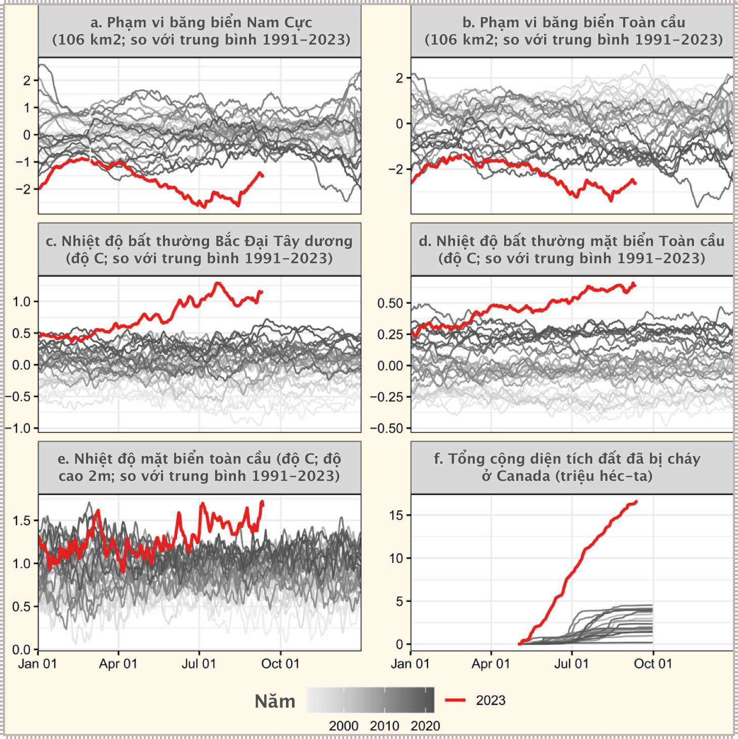 Hình 1 Những hiện tượng bất thường về khí hậu vào năm 2023 (đường màu đỏ, được in đậm). Phạm vi băng biển (a, b), nhiệt độ (c–e) và diện tích bị đốt cháy ở Canada (f) hiện nằm ngoài phạm vi lịch sử của chúng. Những bất thường này có thể là do cả biến đổi khí hậu và các yếu tố khác. Mỗi đường trong đồ thị tương ứng với một năm khác nhau, với màu xám càng đậm tượng trưng cho những năm càng gần đây.