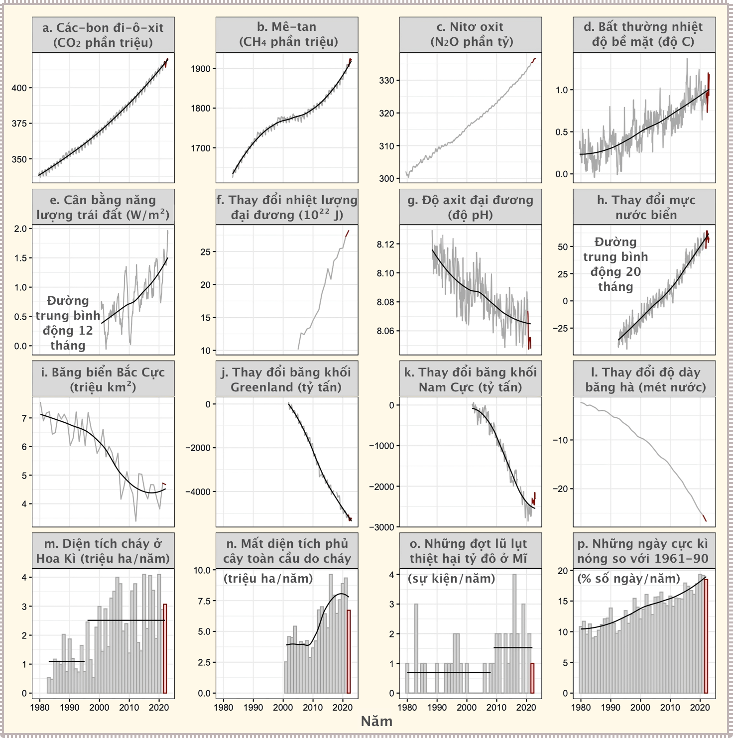 Trên cơ sở số liệu thống kê từ đầu năm đến năm 2023, ba loại khí nhà kính quan trọng là CO2 (các-bon đi-ô-xit), CH4 (khí mê-tan) và N2O (khí ôxit-nitơ) đều ở mức kỷ lục (Hình 3a–3c). Nồng độ các-bon trung bình toàn cầu nay ở mức xấp xỉ 420 phần triệu (ppm), vượt xa giới hạn hành tinh (planetary boundary) được đề xuất là 350 phần triệu (Rockström và cộng sự 2009). Ngoài ra, năm 2023 có xu hướng trở thành một trong những năm nóng kỷ lục (Hình 1e và Hình 3d). Mặc dù phát thải khí nhà kính liên quan đến nhiên liệu hóa thạch là nguyên nhân chính làm tăng nhiệt độ, nhưng sự sụt giảm phát thải SO2 (lưu huỳnh đi-ô-xít) trên toàn cầu có thể là một yếu tố góp phần. SO2 tạo thành sunfat trong khí quyển, là tác nhân làm giảm nhiệt mạnh nhất do con người tạo ra, che giấu một phần nguyên nhân làm khí nhà kính nóng lên (xem phần trên với ví dụ về qui định vận tải biển).