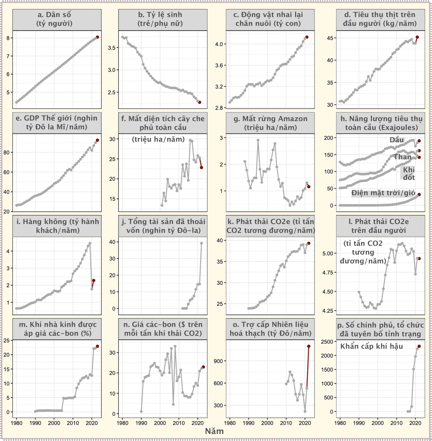 Hình 2 Đồ thị chuỗi thời gian của các hoạt động của con người liên quan đến khí hậu. Dữ liệu thu được kể từ khi Ripple và đồng nghiệp xuất bản (2021) được hiển thị bằng màu đỏ (bản in màu xám đậm). Trong phần (f), mất độ che phủ của cây bao gồm mất độ che phủ do bất kỳ nguyên nhân nào và không tính đến việc tăng thêm rừng.