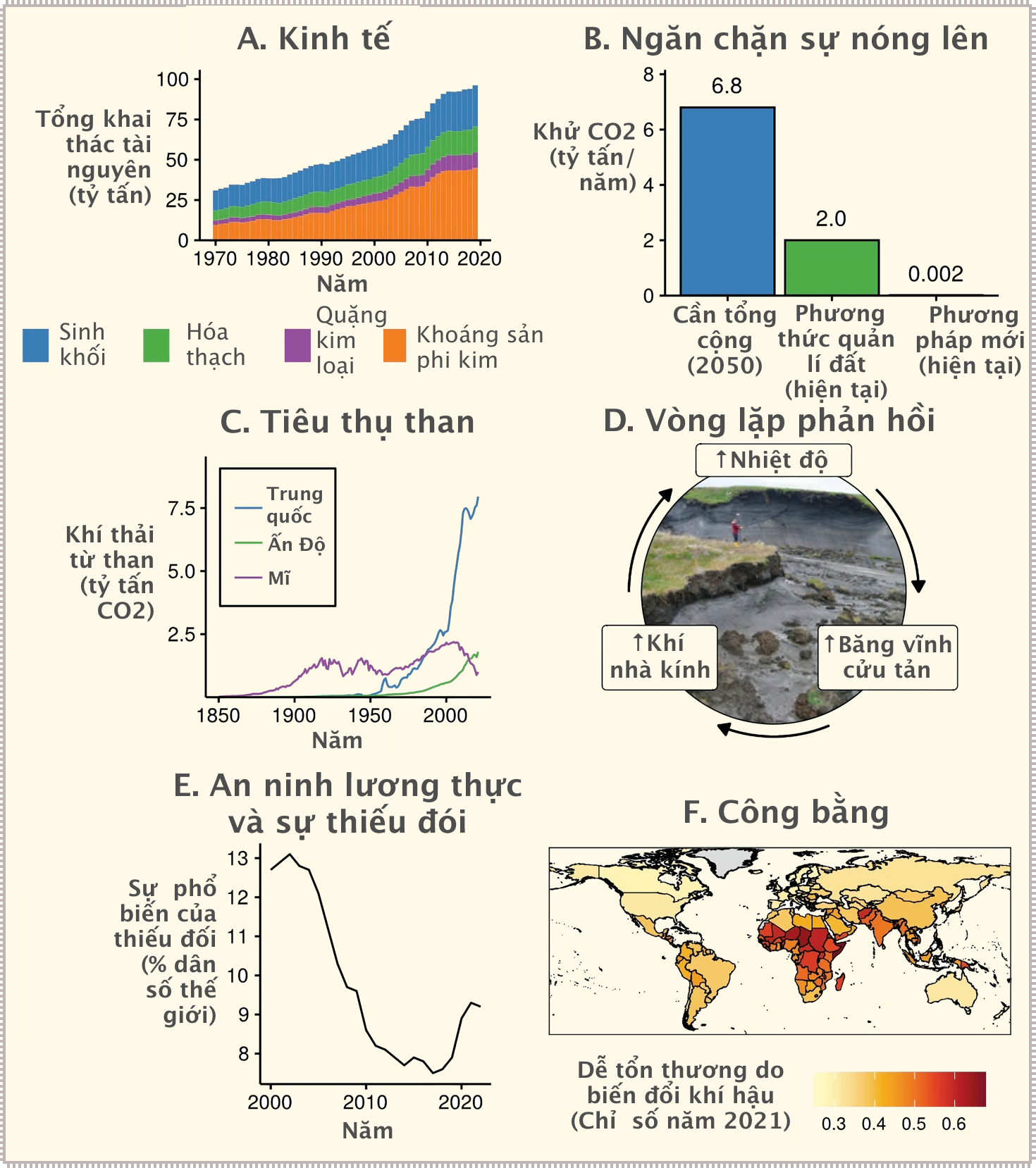 Hình 5 Các chủ đề đặc biệt về hành động vì khí hậu. Nhiều mô hình giả định rằng tăng trưởng GDP hầu như có thể được tách rời khỏi khí thải và các tác động môi trường liên quan đến tiêu dùng khác (a) và các phương pháp thu hồi carbon có thể được mở rộng nhanh chóng (b). Nếu những giả định này không thực tế và việc sử dụng than đá cũng như các nhiên liệu hóa thạch khác không được cắt giảm ngay lập tức ©, thì các vòng phản hồi của hệ thống Trái đất (d) có thể dẫn đến các tác động khí hậu tăng tốc nhanh chóng, bao gồm suy dinh dưỡng (e) và thảm họa khí hậu, sẽ đặc biệt nghiêm trọng ở các quốc gia kém thịnh vượng hơn vốn có lượng phát thải thấp trong lịch sử (f). Ảnh: Boris Radosavljevic (CC BY 2.0)