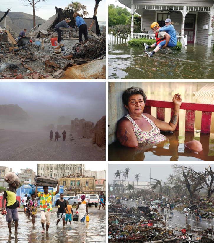 Hình 4 Chuỗi ảnh mô tả tác động của các thảm họa liên quan đến khí hậu. Hàng đầu tiên (từ trái sang phải): Chủ nhà phân loại các mảnh vụn sau khi trận cháy rừng phá hủy nhà của họ ở bang California (Hoa Kỳ, 2008; FEMA/Michael Mancino), “người bảo vệ [Quốc gia] cõng một phụ nữ trong nước lũ ngập đến thắt lưng” (Hoa Kỳ , 2017; Zachary West/Vệ binh Quốc gia; CC BY 2.0). Hàng thứ hai: “các cô gái trẻ bị bão cát trên đường đến trường” (Afghanistan, 2019, Solmaz Daryani/Climate Visuals Countdown; Creative Commons), “một người đàn bà ngồi trong nhà, ngập trong nước sâu, và đang hút thuốc” (Brazil, 2015; Fabrice Fabola, CC BY-SA 2.0). Hàng thứ ba: hậu quả của Bão Idai (Mozambique, 2019; Denis Onyodi: IFRC/DRK/Climate Centre, CC BY-NC 2.0), “người dân đi bộ trên con đường rải đầy mảnh vụn sau khi Siêu bão Haiyan tàn phá thành phố Tacloban” (Philippines, 2013; Erik de Castro/Reuters; CC BY 2.0). Tất cả các trích dẫn đều lấy từ dự án Climate Visuals.