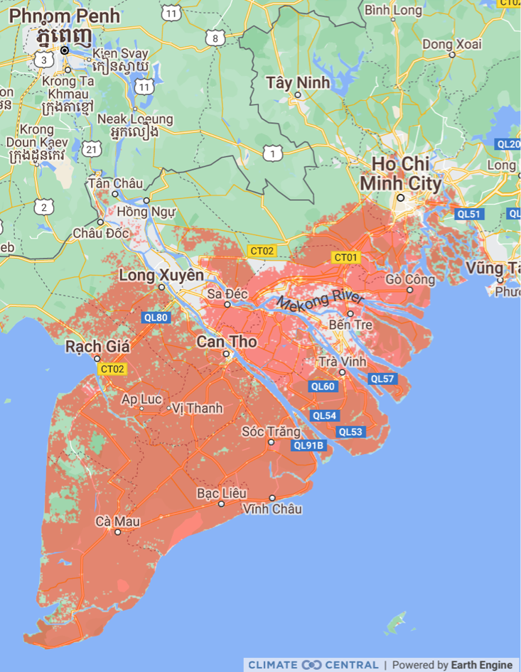 Hình 2: Ngập nước. Dự đoán đất ngập nước lúc thủy triều lên ở vùng Đồng bằng Sông Cửu Long năm 2050. Theo ước tính của Climate Central