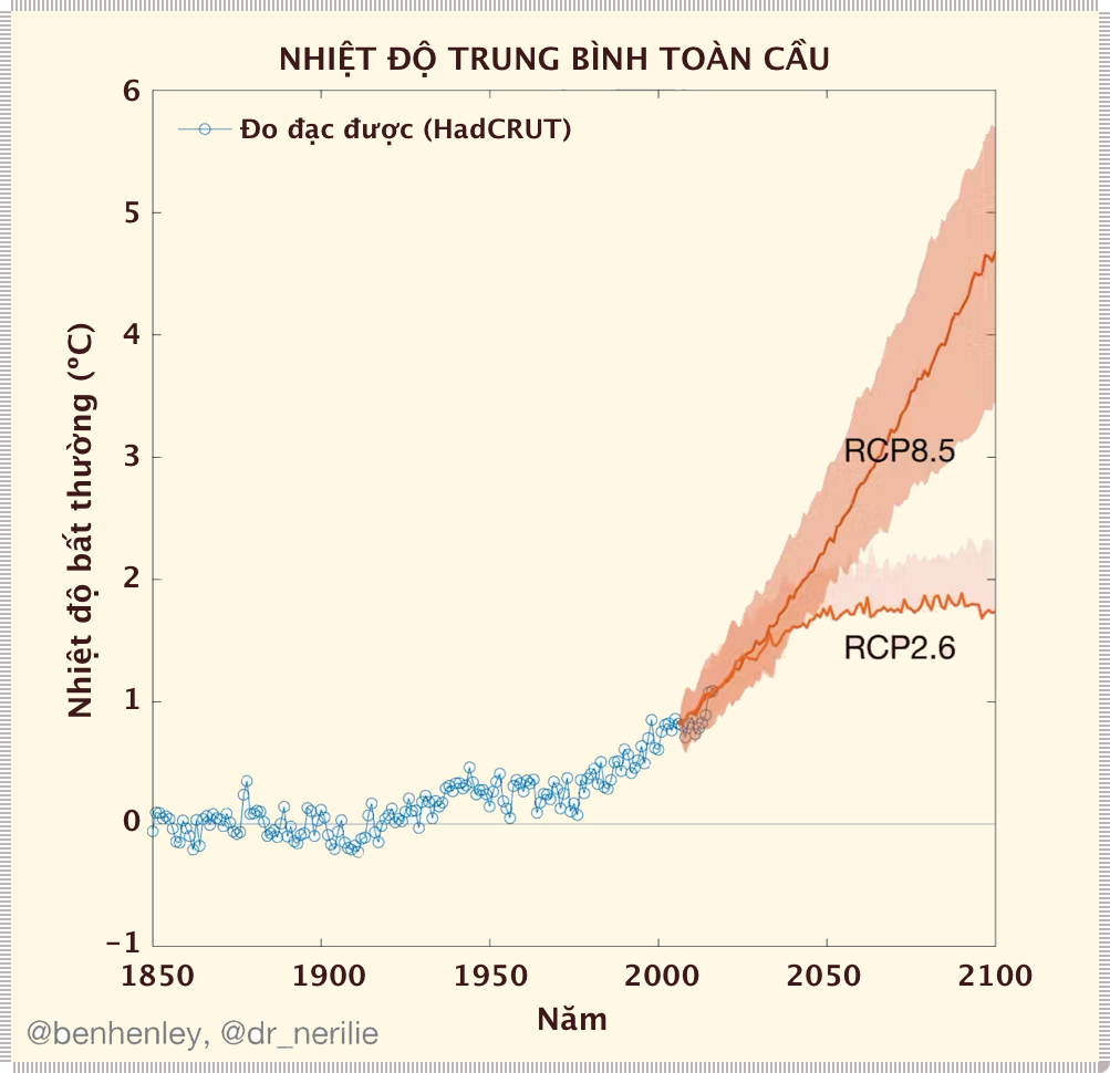 Nhiệt độ toàn cầu được quan sát và dự báo trong kịch bản phát thải CO₂ cao (RCP8.5) và thấp (RCP2.6). Nguồn: Ben Henley và Nerilie Abram